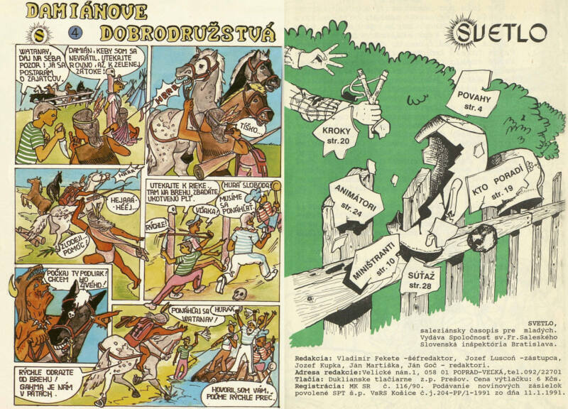 Tak snáď ešte priložím tiráž: „SVETLO, saleziánsky časopis pre mladých. Vydáva Spoločnost sv.Fr.Saleského Slovenská inšpektória Bratislava. Redakcia: Vladimír Fekete -šéfredaktor, Jozef Luscoň -zástupca, Jozef Kupka, Ján Martiška, Ján Goč – redaktori. Adresa redakcie: Velické nám.1, 058 01 POPRAD-VEĽKÁ,tel.092/22701 Tlačia: Duklianske tlačiarne z.p. Prešov. Cena výtlačku: 6 Kčs. Registrácia: MK SR č. 116/90. Podávanie novinových zásielok povolené SPT š.p. VsRS Košice č.j.204-PP/1-1991 zo dňa 11.1.1991″
