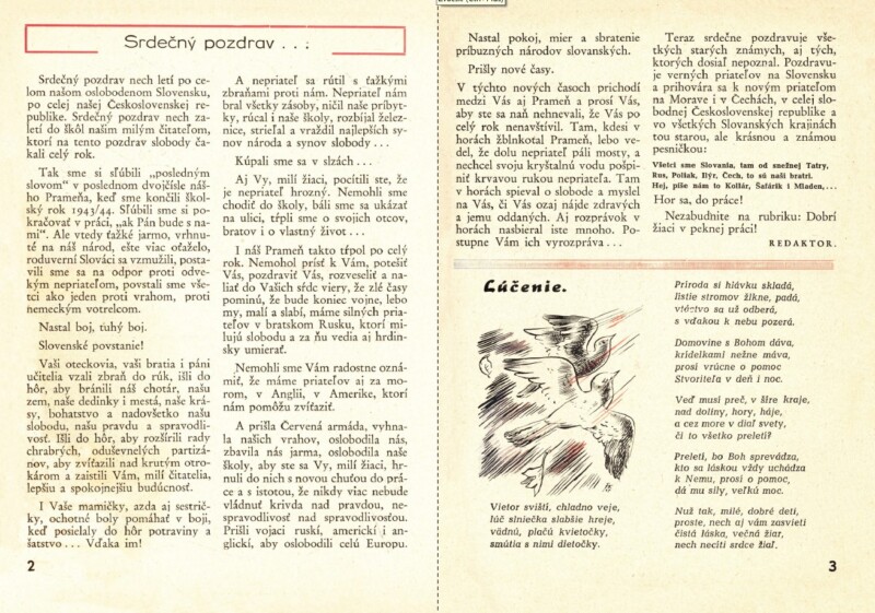 „… Tak sme si sľúbili „posledným slovom“ v poslednom dvojčísle nášho Prameňa, keď sme končili školský rok 1943/44. Sľúbili sme si pokračovať v práci, „ak Pán bude s nami“. Ale vtedy ťažké njarmo, vrhnuté na náš národ, ešte viac oťaželo, roduverní Slováci sa vzmužili, postavili sme sa na odpor proti odvekým nepriateľom, povstali sme všetci ako jeden proti vrahom, proti nemeckým votrelcom…”